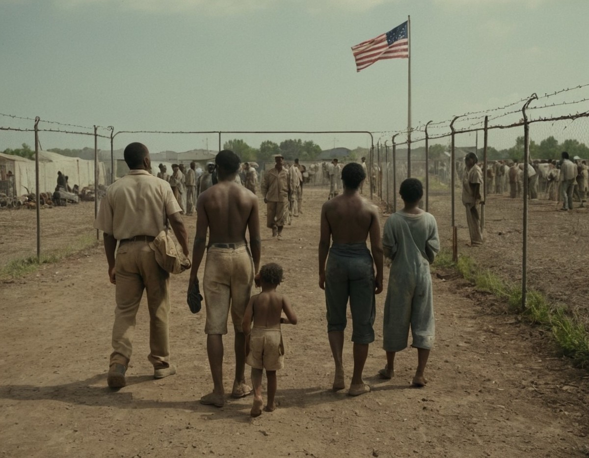 The image portrays the author’s interpretation of what a return to Black enslavement might look like in modern-day America, imagined in the year 2026. It depicts a father arriving at a work site with his young children—barefoot, poorly dressed, and visibly unkempt—because there is no childcare available. Their mother is absent, a victim of modern-day human trafficking. The scene reflects the erosion of dignity, stability, and freedom in a society that has allowed exploitation to return under new names.