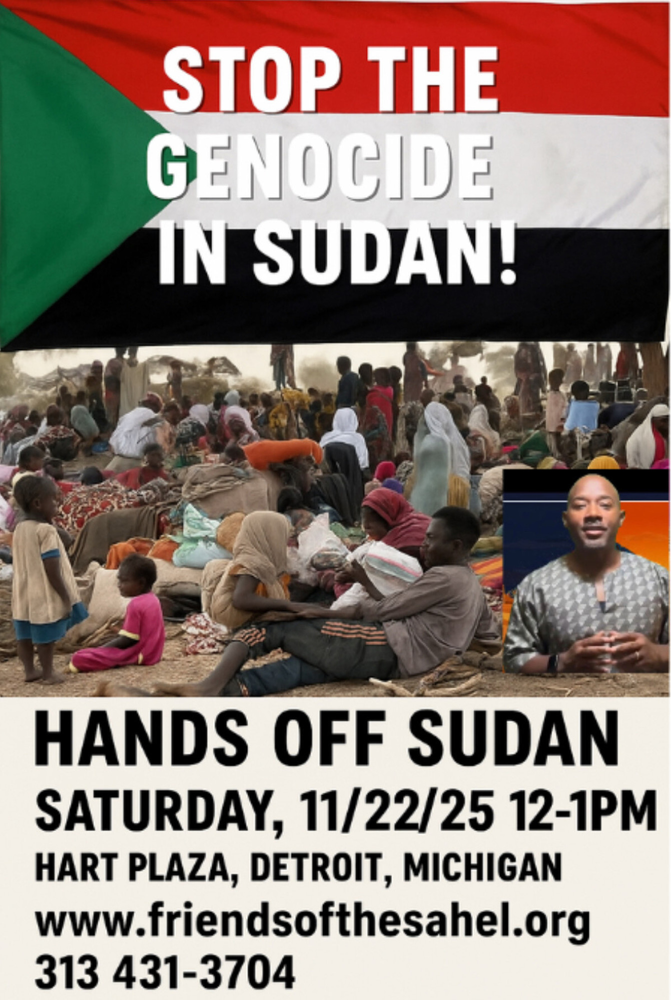 For those in the Detroit area, a Hands Off Sudan Demonstration will take place on November 22, 2025, at Hart Plaza from 12:00 PM to 1:00 PM. This gathering aims to raise awareness, show solidarity, and call attention to the genocide and foreign exploitation taking place in Sudan. Viewers are encouraged to attend, share this message, and stand firmly with the Sudanese people during this critical moment.