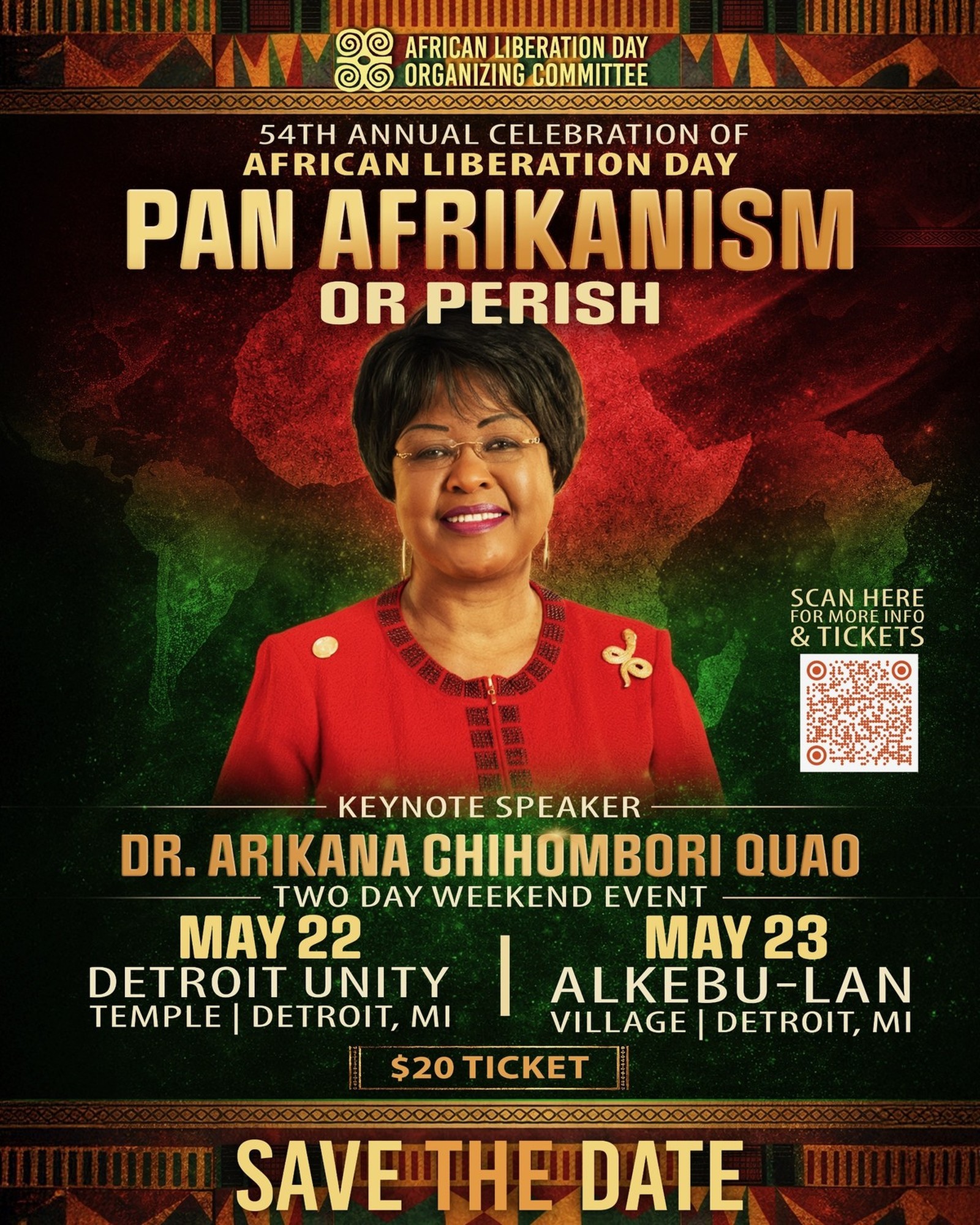 Day 1 — Friday, May 22, 2026 at Detroit Unity Temple, Detroit, MI Day 2 — Saturday, May 23, 2026 at Alkebu-Lan Village, Detroit, MI Tickets: $20 — Scan the QR code on the flyer or visit the African Liberation Day Organizing Committee for more info.